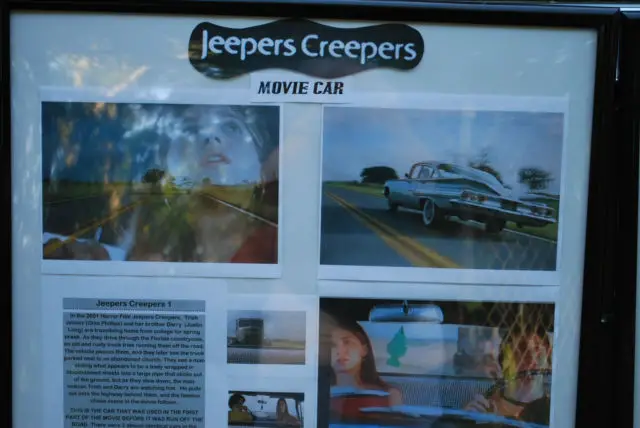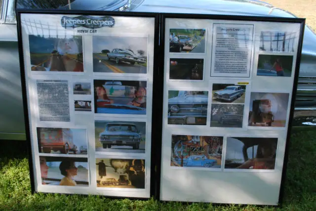 For auction is the main car used in the 2001 Horror Movie "Jeepers Creepers". The movie starred Justin Long and Gina Phillips. and at the time. nbsp; it was the highest grossing Labor Day release of all time. The movie "Halloween" now holds the #1 spot. The car is a 1960 Impala sedan. There were actually 2 almost identical cars used in the movie. nbsp; and one was damaged in the rear when being forced off the road by the "Creeper". The movie was filmed in Central Florida in the Ocala area. This car is featured in the opening scenes. nbsp; and is prominent in the early parts of the move. The car has been kept very close to the way it was in the movie. I have tuned it up and done some brake work. nbsp; as well as added new tires. The interior is exactly as in the movie. nbsp; but I did have to restore the bottom part of the front seat. and recover it with new matching material. It still has the front and rear attachment mechanisms that were used to attach the camera platforms. etc. The interiors of both cars were custom made to look the same. nbsp; and cover the original interiors. In the movie the car was represented as a stick shift on the floor. nbsp; so the original "Fake" floor shifter is still there. The automatic shift lever on the steering column is made to be removable. nbsp; but it was left on for most of the movie. This car will be a major hit at any car show you will go to. nbsp; as many people have seen this movie and will recognize it. A DVD of the movie. nbsp; as well as a DVD player goes with the car. The two picture boards shown also will be included. The car runs great. nbsp; and the engine and transmission are in good shape. It is a 6 cylinder with the original powerglide transmission. nbsp; and it should be very reliable for taking to local car shows. The lights. signals. brake lights. and even the interior light work. The gas and temperature gauge are both working. I will assist the new owner with shipping within the USA and also internationally. It has a clear Florida title in my name. The car will be available locally. nbsp; so I reserve the right to end the auction at any time. This is a very unique car to own. and could be a phenomenal investment. as well as a lot of fun for someone. Good luck bidding. nbsp; and contact me if you wish to purchase the car before the end of the auction.