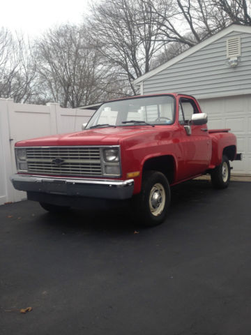 1984 Chevy K10 Step side v8 305 4speed runs great. Truck has been sitting for two years and needs some work to be road worthy. Truck needs brake lines. shocks and spring hangers from rotting out. Truck is located in East Patchogue N. Y. Sold as is where is.