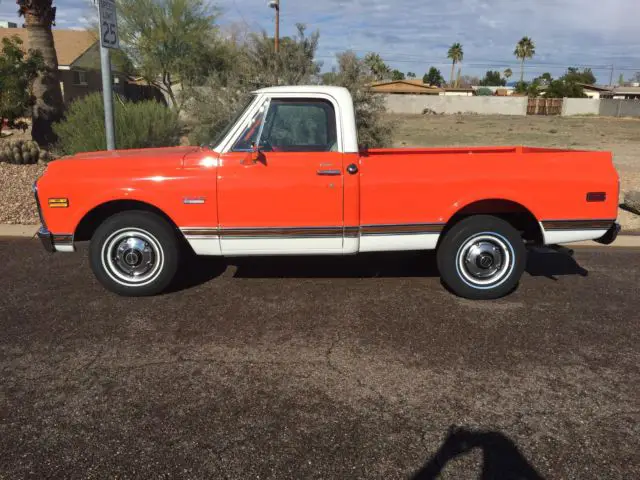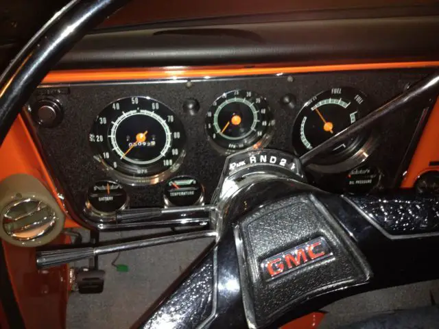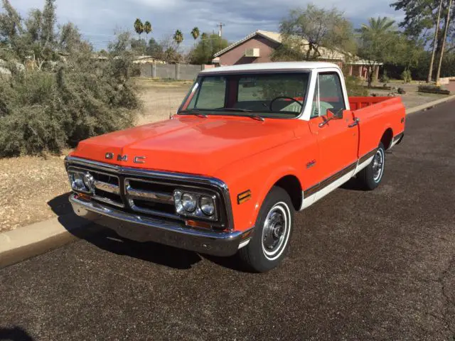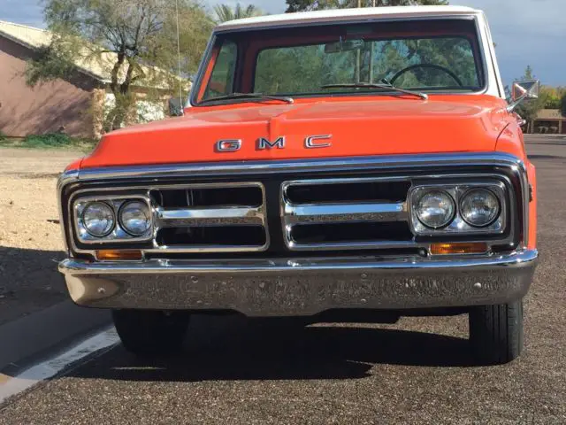 This beautifully restored 1971 GMC short bed has had a complete frame off restoration. It has taken over two years to complete. Every nut and bolt was removed and either reconditioned or replaced. It has all of its original sheet metal absolutely no rust anywhere on this truck. It has spent its entire life in Arizona. It is all original and came equipped with power steering. achometer. tilt wheel. ir-conditioning. tinted glass. It also has its factory hugger orange and white paint. The truck has 200 miles on it basically the break-in period. It is the original motor and transmission. This truck is not a made up truck it's the real deal. I don't believe there's one as nice anywhere. And I quote (flawless restoration) is what the appraiser wrote about this truck. Everything on the truck works as it should. If you have any other questions please don't hesitate to contact me.