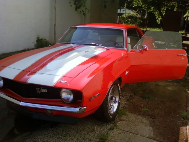 HERE'S THE REAL DEAL ( 1969 CAMARO Z28 DZ 302 ) ALL NUMBERS MATCHING. MUNCIE 4 SPEED MANUAL. ALL ORIGINAL ENGINE. INTERIOR ALL CLEAN . REAL NICE PAINT NOT THE SAME PAINT CODE ( ORIGINAL PAINT CODE (57)FATHOM GREEN NOW HAS A HUGGER ORANGE NICE PAINT WITH WHITE STRIPS . THE UNDER CARRIAGE IS ALL COMPLET AND NEW . FOR MORE INFORMATION PLEAE EMAIL ME WITH YOUR QUESTIONS DONT COME WITH B/S OFFERS JUST BECAUSE WE LIVE IN PHILLY DONT MEAN WE DONT KNOW ABOUT CARS . ( WITH PROTECTOR PLATE ) FROM THE FIRST OWNER. THIS CAR WAS BUILT IN THE 3RD WEEK IN JANUARY 1969 I WILL NOT DRIVE THIS CAR TO MEET YOU ANYWHERE . YOU MUST COME SEE IT IN PERSON