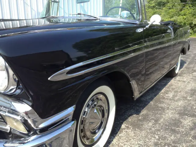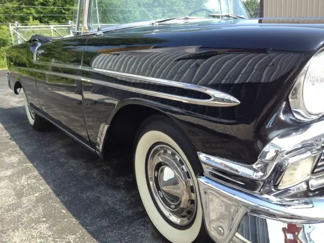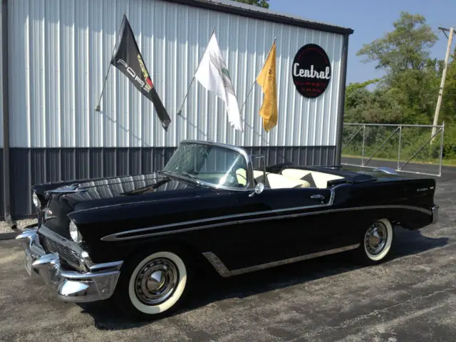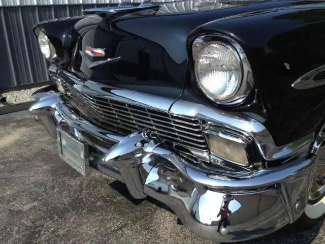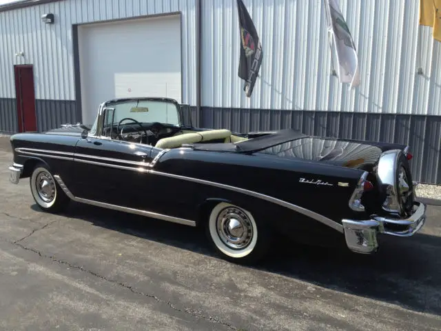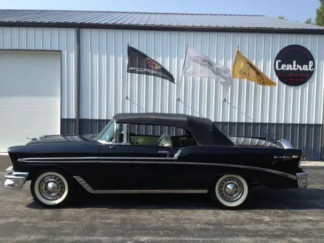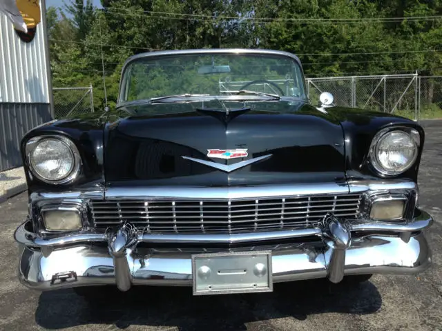 The 50’s beauty of black paint and gleaming chrome. “The Hot One is Even Hotter” was the motto that Chevrolet boasted for its 150. 210 and Bel Air series in 1956. With a new Super Turbo Fire V8. the new 1956 promised a friskier. sweeter ride with safer passing. Playing off the success of the previous year redesign. the new 1956 Chevy was met with an appetite of frenzy from the buying public. Minor changes were made to the 1956. including new engine options. a slightly different dash. a newly hidden gas filler cap in the rear fin. and colors. trim and fabrics. The ’56 Chevy was a hit as sales continued to climb. CONDITIONS:Body and paint: are in very good to excellent condition. The paint is mostly original from the doors back. The front fenders and hood have been repainted. The front fenders were stripped to bare metal and are in perfect (no rust or rust repair)condition. Top: soft top (replacement) in good to very good condition. The plastic rear window is clear with some yellowing. Chrome and bright work: a number of optional chrome/bright work pieces (see photos) in very good to excellent condition. Rare driver’s remote outside mirror. Interesting option of the prism style traffic light detector on driver’s side dash. Continental spare tire option. Glass: Very good condition ( slight windshield wiper scuff on windshield)Weather stripping/rubber: Very good condition. Wheels/tires: Very good condition. Bias ply white wall tires (5). iuWheel wells/undercarriage: good overall condition. frame very good condition. floors are solid and in good condition with little to no rust. New rear leaf springs. Engine/engine bay: very nicely detailed/correct in very good to excellent condition. The car runs and drives very well with no needs. Trunk: very nicely detailed. the floor is in good condition with two small areas of rust. Interior: considering the interior is mostly original/non restored. the over all look is very nice with light patina. The carpeting is newer. replacement. The front seat has three small spots of wear (driver area). The rear seat is very nice with no wear. The side panels/door panels are in very nice condition. The dash/gauges/steering wheel/correct radio are in very good condition. The miles shown on the odometer do not represent the mileage on the car. The column shift has been moved to the floor (I have the parts needed to replace it back to the column). Books: owner’s booklet and shop book. Title (copy of second owners title. ownership 1967-2014)If you would like to see more photos (many available) of this car. contact me . This is a great looking and driving Bel Air. The patina it wears. gives the car it’s beautiful feel and personality. The BelAir is listed on other web sites and locally. We reserve the right to stop the auction before its conclusion. The BelAir is being sold "as is" with no warranties stated or implied. More photos can be seen on Central Classic Car's web site.