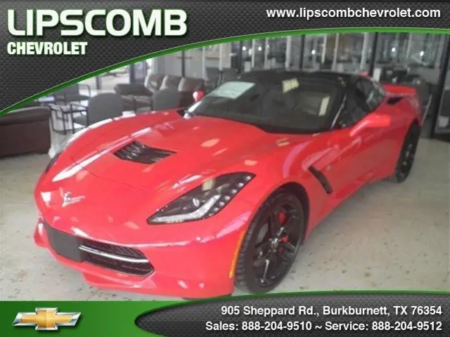 2015 Chevrolet Corvette Stingray Z51 (940) 202-7675 ext. 19 Engine: 6. 2L V8 Body Style: Coupe Exterior Color: Red Doors: 2 Drivetrain: RWD Stock #: CF9325 Vin:1G1YK2D76F5109325 Lipscomb Chevrolet Address: 905 Sheppard RdBurkburnett. TX 76354 Contact: Sales Dept Phone: (940) 202-7675 ext. 19 Fax: 9404343094 Email: brian@lipscombchevrolet. com CONTACT DEALERSHIP APPLY FOR FINANCING VIEW DEALERSHIP SHOWROOM Vehicle Overview All Around hero!! There is no better time than now to buy this admirable Corvette* Internet Deal on this appealing 2015 Chevrolet Corvette Stingray Z51!! $2. 00 below MSRP. Optional equipment includes: Wheels: 19" x 8. 5" Fr & 20" x 10" Rr Black Alum. - Includes (48. 3 cm x 21. 6 cm front and 50. 8 cm x 25. 4 cm rear). Preferred Equipment Group 2LT - Includes Bose Advanced 10-Speaker Audio System Feature (Includes bass box). Luggage Shade. Cargo Net. Head-Up Display (Includes color readouts for street mode. track mode with g-meter. vehicle speed and engine rpm). Memory Package (Recalls 2 driver presets for 8-way power seat. outside mirrors and tilt/telescoping steering column). Auto-Dimming Inside Frameless Rearview Mirror. Heated & Vented Driver & Passenger Seats. Power Lumbar/Bolster Seat Adjusters. Theft Deterrent System (Body security content and unauthorized entry electrical). Universal Home Remote (3-channel programmable garage door opener. located on driver visor). Body-Color Outside Heated Power-Adjustable Mirrors (Includes driver side auto dimming). For more information on this or any other new or preowned vehicle visit us at www. lipscombchevrolet. com Dealership Features Warranty Terms of Sale Disclaimer Vehicle Features Auto-Dimming Inside Frameless Rearview Mirror Body-Color Outside Heated Power-Adjustable Mirrors (Includes driver side auto dimming) Cargo Net Head-Up Display (Includes color readouts for street mode Heated & Vented Driver & Passenger Seats located on driver visor) Luggage Shade Memory Package (Recalls 2 driver presets for 8-way power seat outside mirrors and tilt/telescoping steering column) Power Lumbar/Bolster Seat Adjusters Theft Deterrent System (Body security content and unauthorized entry electrical) track mode with g-meter Universal Home Remote (3-channel programmable garage door opener vehicle speed and engine rpm) 2 Doors 4-wheel ABS brakes 460 hp horsepower 6. 2 liter V8 engine Air conditioning with dual zone climate control Audio controls on steering wheel Bluetooth Center Console - Full with covered storage Clock - In-radio display Compass Cruise control Cylinder Deactivation Daytime running lights Dusk sensing headlights External temperature display Fuel economy EPA highway (mpg): 29 and EPA city (mpg): 17 Interior air filtration Intermittent window wipers Keyless Ignition - Doors and ignition Limited slip differential - Electro-mechanical Multi-function remote - Trunk/hatch/door/tailgate Passenger Airbag Power heated mirrors Power windows with 2 one-touch Preferred Equipment Group 2LT - Includes Bose Advanced 10-Speaker Audio System Feature (Includes bass box) Privacy/tinted glass Rear defogger Rear-wheel drive Remote power door locks Speed-proportional power steering Stability control Tachometer Tilt and telescopic steering wheel Traction control - ABS and driveline Trip computer Video Monitor Location - Front Wheels: 19" x 8. 5" Fr & 20" x 10" Rr Black Alum. - Includes (48. 3 cm x 21. 6 cm front and 50. 8 cm x 25. 4 cm rear) Xenon headlights Warranty Unless otherwise noted. this vehicle is being offered with a full manufactures rebate. Please call for specific warranty details on this vehicle. Shipping Terms of Sale This vehicle is also for sale on our lot and other advertising sources. we reserve the right to end this listing at anytime should the vehicle no longer be available for sale. The following terms of sale apply to all of our auctions. Payment Terms: The successful high bidder will required to submit a $500 non-refundable deposit within 48 hours of the close of the auction to secure the vehicle. Understanding that the vehicle will remain available for purchase until the deposit has been secured. Buyer agrees to pay remaining balance due (plus applicable fees and taxes) within 5 business days of the close of the auction. All financial transactions must be completed before delivery of the vehicle. Payment Methods: Cash (in person). certified check. bank transfers. or 3rd-party financing. Fees and Taxes: Out of state buyers are responsible for all state. county. city taxes and fees. as well as title/registration fees in the state that the vehicle will be registered. Disclaimer It is the customer's sole responsibility to verify the existence and condition of any equipment listed. We try our best to thoroughly describe the vehicle and its features. please contact us prior to bidding on the vehicle if you have any questions about the vehicle. We are NOT responsible for misprints on prices or equipment. It is the customer's sole responsibility to verify the accuracy of the prices and equipment with the dealer. Pricing is subject to change without notice.