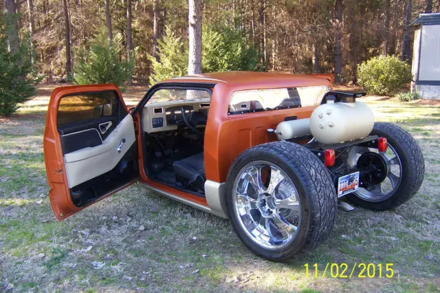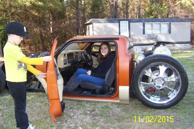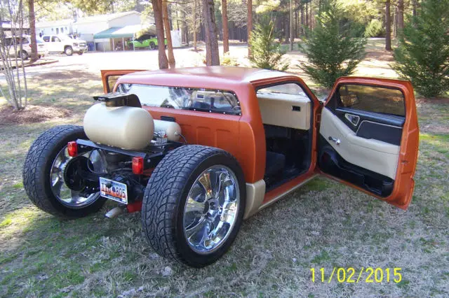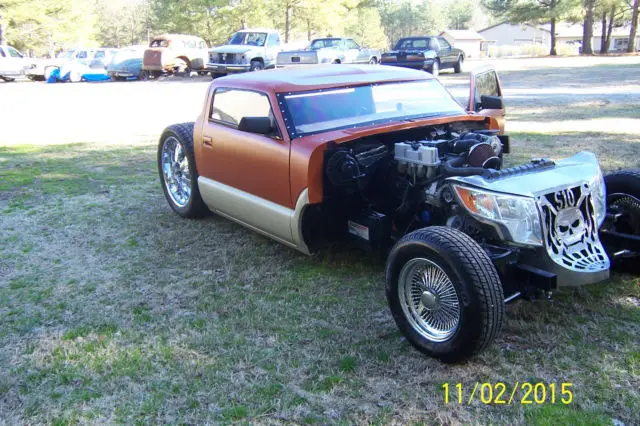 This car is a driver. it is currently licensed. insured. and registered as an S-10 under its. original factory VIN. We routinely drive it to car shows 30 miles and more each way. and in parades and just around town as a grocery getter. (but allow extra time because it does draw a crowd). The car runs straight down the road no wandering and no pulling to either side when the brakes are applied. No over-heating or stalling problems in parades or on the road at 55-60+ mph. This is a match box car it has LOTS of show wins including BEST IN CLASS (rat rod) at the 2013 NOPI Nationals in Atlanta. '94 S-10 cab chopped 8 1/2 inches. paint is Hot Rod Flatz orange and suede. the interior is finished except for the head-liner I haven't finished it because I have some neon I wanted to put up there (I'll include the pad and cloth and neon with the car). The top used to be the hood by the way. Custom built dash ('cause you couldn't see out over the stock dash) uses the original S-10 instruments and light and heater/ventilation switches (they all work but the speedo reads a little slow because of the SLIGHTLY over-size wheels and tires out back). Roll-up side windows. jack handle shifter. back-up camera. The frame and X member and cross-ties are entirely custom built of 2x3x3/16 square tubing. And if you just gotta throw a V-8 in there it can absolutely handle any small block. The front end is Mustang II IFS and cross member with disc brakes and polished rack and pinion steering. all brand new from hub to hub. The air bags are goodyear. Vi-aire compressor and air tank. nbsp;the valves raise the front and rear separately from slammed on the ground (frame and body but you can still open the doors). to a height of 5 1/2 inches. Rear suspension is tubular ladder bar with a pan-hard bar. dana rear-end. Gas tank is a modified LP tank that uses the S-10 fuel pump and fuel level sender. The grille is plasma cut sheet metal buffed and clear-coated. Engine is 2. 3L stock S-10 4 cyl. 5 speed tran. I will deliver for free (drive it to you) within 100 mi. of Saluda SC. After full pay. On Mar-18-15 at 07:21:18 PDT. seller added the following information: RESERVE JUST LOWERED ON 3/18 ------RESERVE JUST LOWERED ON 3/18 RESEERVE JUST LOWERED ON 3/18