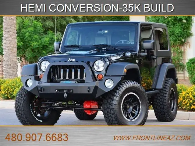 5.7 HEMI CONVERSION WITH 5 SPEED AUTOMATIC TRANSMISSION 35K SPENT ON BUILD A FULL HEMI CONVERSION WAS DONE BY BURNSVILLE OFF ROAD / DAKOTA CUSTOMS WHEN THE JEEP WAS NEW. THE CONVERSION INCLUDED A BRAND NEW 5.7L HEMI POWER PLANT, 545RFE 5 SPEED AUTOMATIC TRANSMISSION, EMI RADIATOR, IL COOLER, IRE HARNESS, ND ALL OF THE NECESSARY MOPAR PARTS REQUIRED FOR INSTALL. IN ADDITION TO THE HEMI CONVERSION, TERAFLEX LONG ARM LIFT WAS ADDED AS WELL AS A LONG LIST OF EXTRAS SHOWN BELOW TERAFLEX 9550 SHOCKS ARB IRON DIFFERENTIAL COVERS CUSTOM MAGNAFLOW EXHAUST CUSTOM TERAFLEX REAR BUMPER ROCK SLIDE ENGINEERING FRONT BUMPER RAMSEY 9500LB WINCH AMP RESEARCH POWER BOARDS CUSTOM STEEL SKID PLATES CUSTOM FIBERGLASS HOOD BLACK 17" PRO COMP WHEELS BRAND NEW 35" BFG M/T TIRES ORIGINALFACTORY EQUIPMENT FRONT / REAR AXLE LOCKERS ELECTRONIC SWAY BAR DISCONNECT POWER WINDOWS AND LOCKS UPGRADED SOUND WITH SATELLITE RADIO TOW PACKAGE TINTED GLASS FREEDOM 3 PIECE HARD TOP WITH OPTIONAL SOUND INSULATOR EXCELLENT CONDITION BOTH INSIDE AND OUT APPEARS TO HAVERARELY BEEN OFFROAD...SEE PICTURES OF UNDERCARRIAGE...ITS LIKE NEW!! OVER $35K HAS BEEN SPENT ON THEBUILD ARIZONA RUST FREE CARFAX CERTIFIED 35KORIGINAL MILES NON SMOKERS LIKE NEW INTERIOR EXTERIOR BODY AND PAINT ARE EXCELLENT RUNS AND DRIVES BETTER THAN NEW NO DISAPPOINTMENTS OF ANY KIND!!