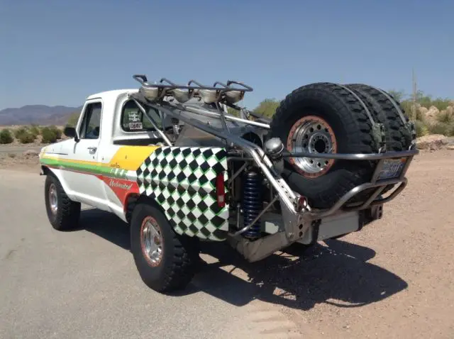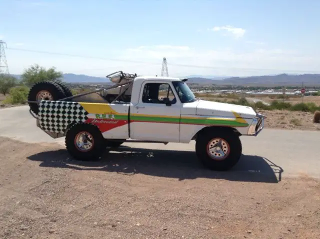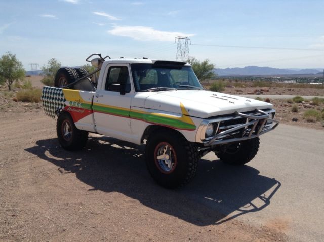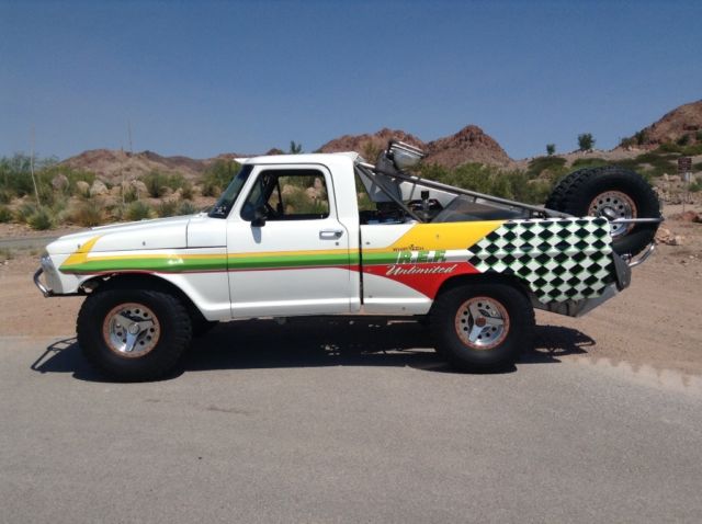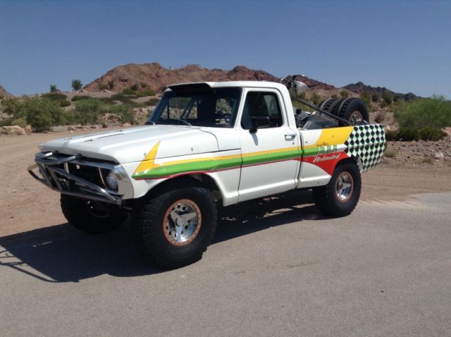 Up for auction is my 1972 F-100 prerunner. This is a FULLY BUILT truck, asically a race truck with a nice interior and windows. This truck was professionally built and is caged front to rear! The engine is a 468ci Oldsmobile V-8 that has over 500 horsepower and 550 foot pounds of desert ripping torque! The engine sits BEHIND THE CAB and is hooked up to a Culhane C-6 race transmission with a manual valve body. The truck puts the power to the ground through a Casale V-drive hooked up to a Mittler Brothers fully spooled and trussed rear end. The front suspension is massive center A-arms with huge custom built coilover and bypass shocks with bumpstops and 28" of wheel travel! The rear suspension is a reverse mezzanine arm 4-link with huge custom built coilover and bypass shocks with bumpstops and 30" of wheel travel! The truck has Wilwood 4 wheel disk brakes. The tires are 37x11.5x17 Bridgestone race tires mounted on Ultra wheels with Champion beadlocks. The knock offs on the wheels are real! The interior is really nice with race seats and 4 point harnesses and the dash is custom built with all Autometer gauges. This is an awesome truck that is totally sorted and ready for any terrain you throw at it!! The truck is really fast with tons of suspension travel! This is the only F-100 built like this and it's one of a kind for sure! BID TO WIN this awesome machine! This truck would costwell over 100k to built and you can own it now for less than half of the initial build cost!Truck is fully street legal and has a CLEAN title ready to go!!