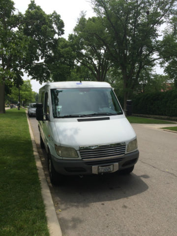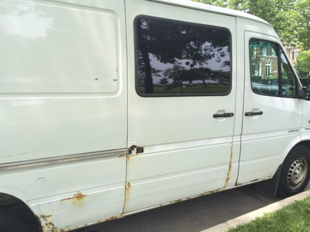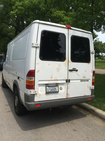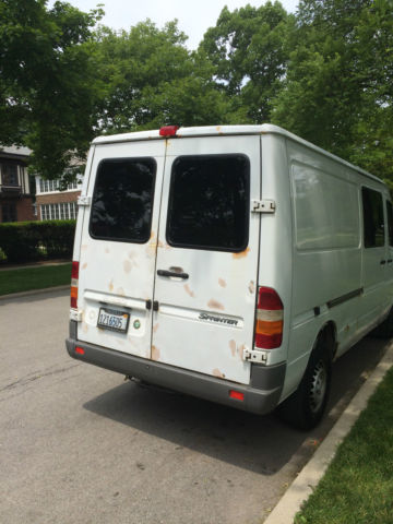 VERY GOOD RUNNING/WORKING CARGO SPRINTER VAN. MOTOR IS A VERY STRONG MERCEDES 2500HC 2.7L INLINE 5. TRANSMISSION SHIFT VERY WELL. NORMAL WEAR AND TEAR FOR 2002. NEEDS SOME TLC JUST LIKE ANY SPRINTER FROM THIS YEAR. THEY RUST. WAS AND STILL IS A VERY RELIABLE CARPENTER VAN. USED TO HAUL WOOD AND TOOLS TO JOB SITES IN AND AROUND THE CHICAGOLAND AREA. THE FRONT SUSPENSION (SHOCKS) WILL NEED REPLACING SOON. OTHER THEN THAT IT IS READY FOR OVER THE ROAD OR AROUND TOWN. THESE SPRINTERS ARE RATED FOR OVER 300,000 MILES. HAS NEW EGR. TIRES ARE ONLY A YEAR OLD WITH PLENTY OF TREAD LEFT. LOCAL PICK UP ONLY. MUST HAVE DEPOSITE WITHIN FIRST 24HRS OFAUCTION ENDING.CALL DENNIS 7737332138.