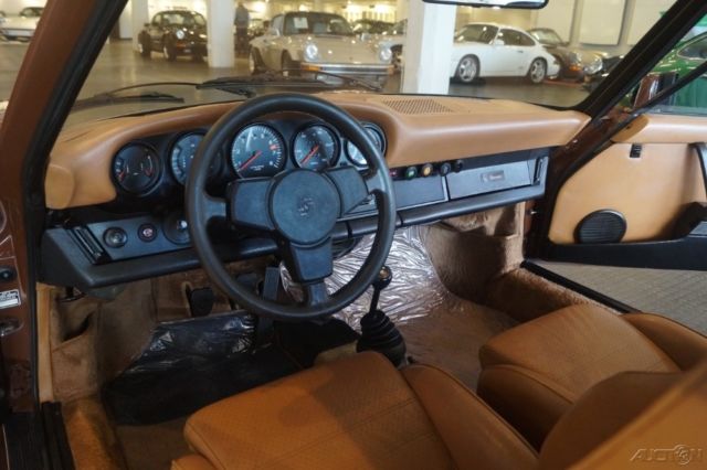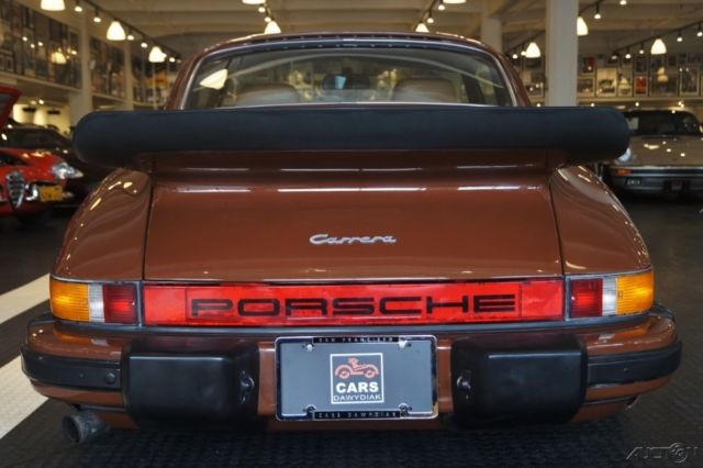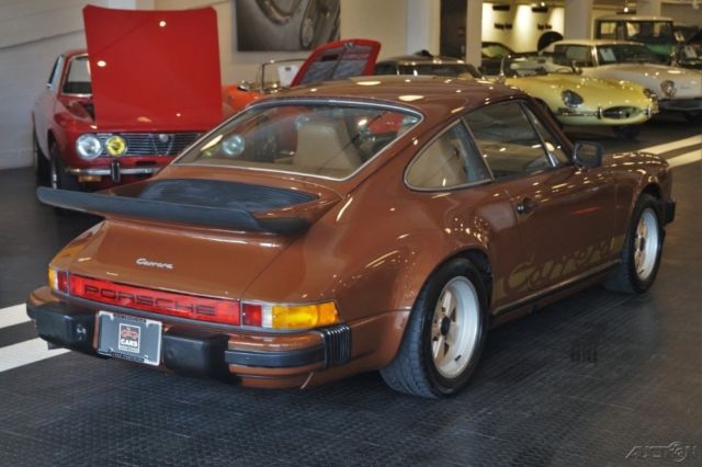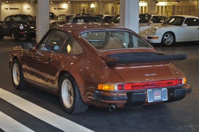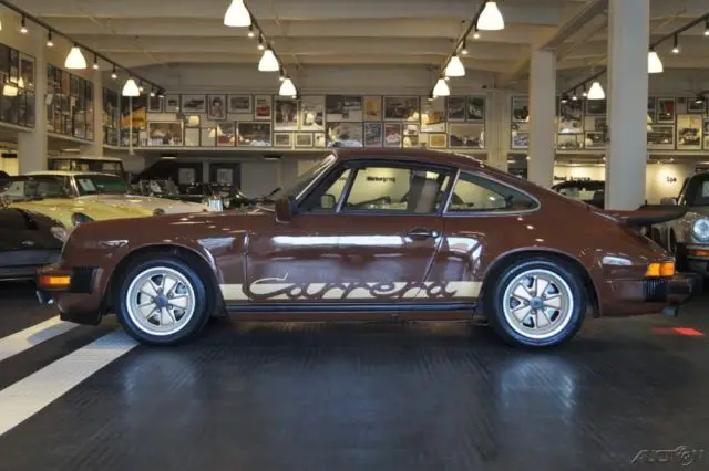 Limited slip diff, sport sears, full leather, car number 289 of 395, rare Bitter Chocolate exterior, service records, owners books, Central casting has delivered this stunning Numbers Matching Carrera in Bitter Chocolate with Gold side script, number 284 of 395 produced. The notable options being Limit Slip Differential, Sport Seats and Full Leather Interior in excellent original condition with the some wear on the drivers seat bolster. Overall this stunner shows as an amazing unrestored & original example. Previous owner reportedly had a windows out respray in the original color and was pleased to discover no evidence of any prior body damage. The original tool kit is intact as well as the spare wheel/tire.With a 109k miles the engine case has never been split and is in extraordinary condition. Transmission shifts up and down thru all 5 gears as does reverse with no evidence of worn synchros Red, black or silver are the more common colors, though a search for another bitter chocolate might prove bittersweet.. if you were to lose out on this one...