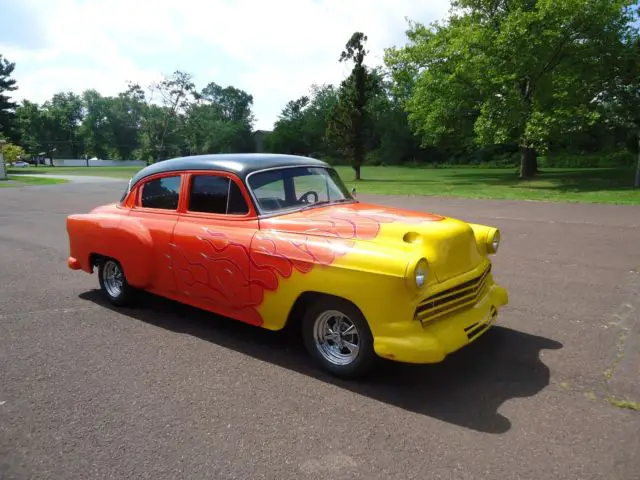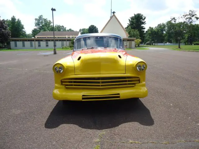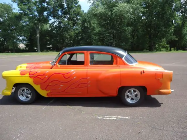 54 Chevy custom, 305 V8, turbo 350 trans, Hurst floor shifter, headers w/dual exhaust, Edelbrock 4 bar. carb. & intake, custom chrome air filter, valve covers, alternator, brkt, etc. Race pro HEI dist.& wires,w/ 12 volt system. Body; nose, decked, shaved door handles, custom grill &flushy tail lts. 57 chevy rear w/modified rear susp., rear air shocks w/ air compressor mounted in trunk & switch in dash. Crager mags w/spinners, 205/70R14 frt. tires & 235/60R14 rear tires. Electric eng. cooling fan, elect. fuel pump over mechanica, elect. wipers, custom dash, auto meter gauges, Eclipse AM/FM cassett deck w/4 spkr. stereo, (Blaupunct Spkrs.) & 12 disk CD changer in glove box. New poly fuel tank, park brake cables, custom mirrors &steering wheel. New kick panels, rear deck, windlace, floor mats, carpetin, inside door handles, seats redone & headliner, door panels presentable, everything works as it should accesseries,windows, latches. Car drives straight, plenty of power, steers & stops good no leaks. Roof was just painted w/ hot rod black. Car looks good from 10 ft. away body is in need of repairs that I don't want to do. A lot was done to this car it's a pleasure to drive & take to shows. I got too many things going on so my loss is your gain. Car is priced to sell with NO RESERVE. However I will consider trades; 49-54 Buick,49-52 Chev, Pont, Olds, 52-54 Ford or Merc. any questions feel free to call 267-664-2923 or email. Please don't bid if your not going to pay. I will require $500.00 non refundable down payment at end of auction. & pick up of car within 2 wks. full payment cash or certified check. I will also try to assist w/ shipping at your expense.