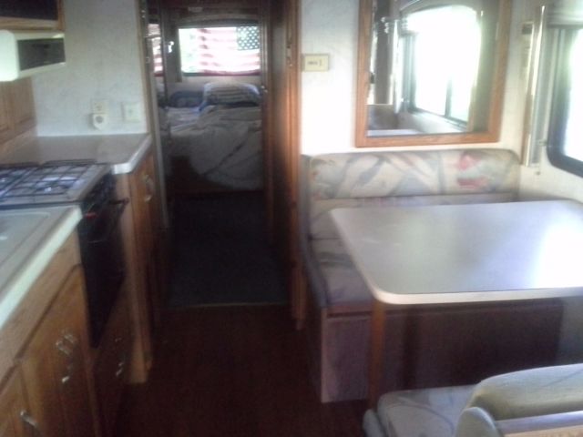 This model has many deluxe features including kitchen with stove/oven, large refrigerator plus washer/dryer and microwave. Bathroom has sink, bowl and shower. Bedroom has queen size bed, 3 windows with custom shades, wardrobe and mini TV. TV also in living room/dining room area. Lots of storage throughout vehicle. This was the deluxe model for it's time.