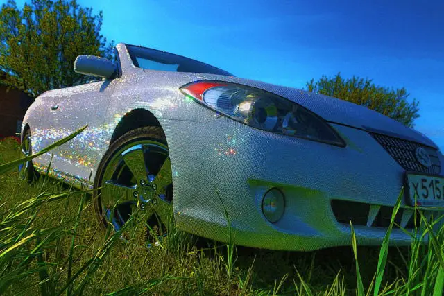 машина в белой пленке. наклеены 400000 страз сваровски. новый кожаный салон. новая крыша. литые хромированные диски 18.