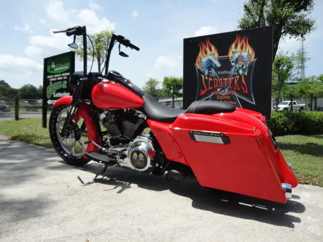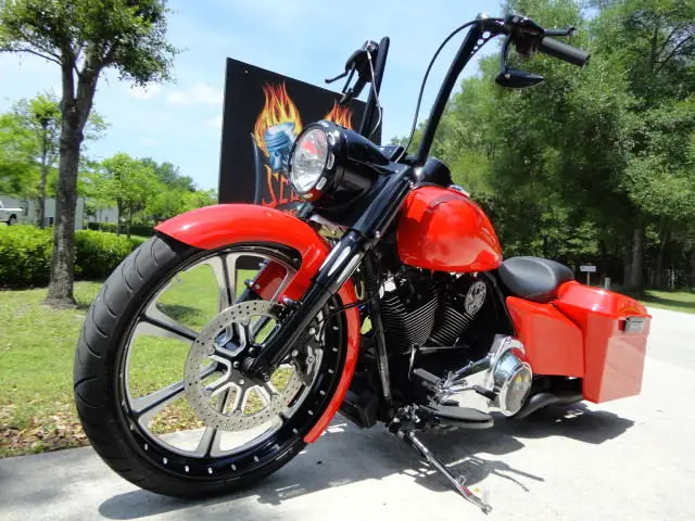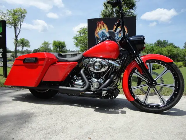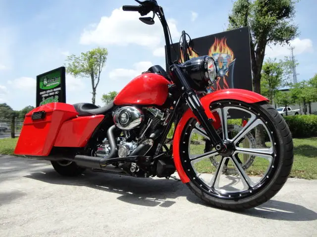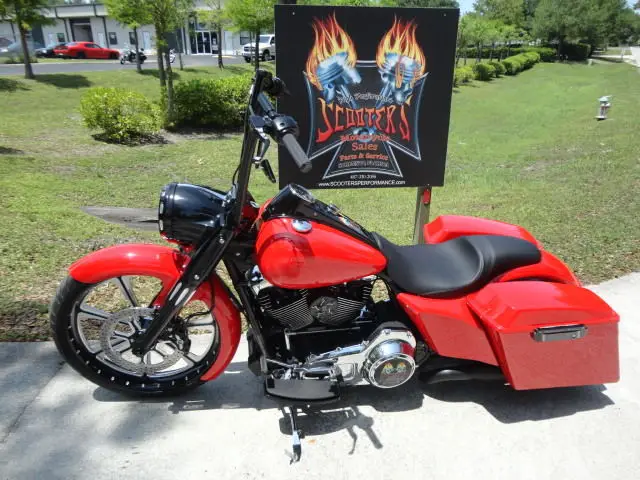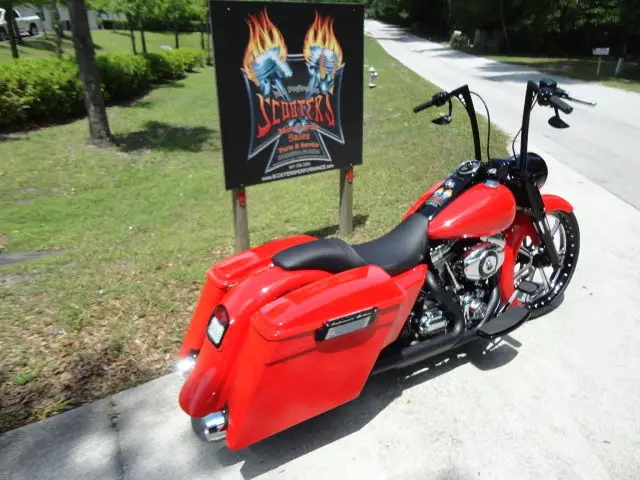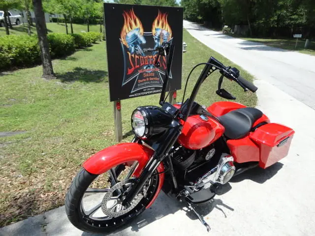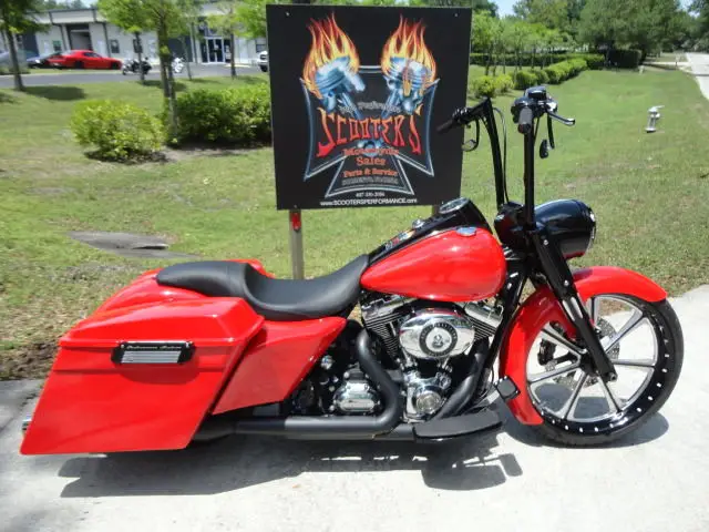 31615 Long Acres Drive. Sorrento. FL 32776. 407-330-2056 2013 Harley Davidson Roadking FLHRP Custom with 23" Roland Sands Design Diesel Wheel Custom Red Paint over new RWD Fenders 23" RSD Front Wheel Contrast Cut Black with 13" Single Disc Rotor HHI X23 Conversion tree to maintain factory rake and handling characteristics with Air Ride front suspension 4" stretched saddlebags with Performance Machine Latch covers RSD 16" Apes w/ Ness Grips & Performance Machine Mirrors This 2013 Ex Police Roadking has had a total make over we started with a 23" Roland Sands Design Front Wheel then we added Hawg Halters X23 front fork tree kit with our own front air ride suspension kit. The bike cruises with full suspension travel no compromised ride. The body mods include a Russ Weirnimont Designs steel one piece rear fender with a recessed license plate and fillers along with high quality ABS 4 inch stretch saddlebags with contrast cut Performance Machine saddlebag latch covers that finish off the rear. Arlen Ness Swoop Side Covers tie nicely into the bags. We topped it off with a Danny Gray seat for comfort and a set of Roland Sands Design Vintage 16" Apes. It has a brand new black Burly Cable Kit and Roland Sands Avenger Levers. Gloss black powder coated front forks with contrast cut fork cans. It was converted to single disc to show off the RSD wheel using a 6 piston brake caliper and a larger 13" diameter rotor to maintain brake performance. A Performance Machine head light bezel finishes off the front end. This bike has had a full service with all fluids changed and complete safety check. It has a complete set of new cables on it. The rear suspension was finished off with a new set 10. 5" slammer rear shocks to give this bike a great stance. They all black exhausts accents the contrast cut billet parts. It has an S&S Hi Flow Air Cleaner to enhance its performance. This bike handles excellent with the HHI X23 kit it is more stable than a 21" front tire bagger. Cruises nicely at any speed. Welcome to the Scooters Performance eBay Store! Payment We accept the following forms of payment for $500 Deposit. Remaining balance to be paid by secure funds such as wire transfer. certified check or cash. PayPalVisaMasterCardAmerican Express Sales TaxFor shipments to Florida addresses. we are required by State law to collect Sales Tax. ShippingScooter's can ship your motorcycle anywhere. Please contact us for a shipping quote. Customer Service CONTACT INFO Scooters Performance 31615 Long Acres DriveSorrento. Florida 32776 Call Us Tuesday - Friday 10a-4p or Saturday 10-2:301-407-330-2056On May-02-15 at 08:04:49 PDT. seller added the following information: MILEAGE IS 44058 SORRY LISTING ERROR 5/2/2015 11:00 amOn May-06-15 at 19:32:50 PDT. seller added the following information: Buy it now price lowered $1000. Lets make a deal!