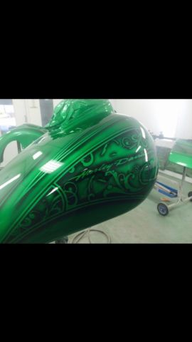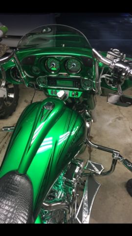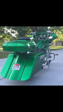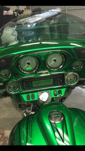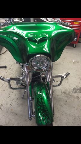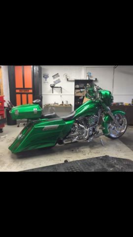 07 custom street glide Just finished two weeks ago Custom House of color candy green paint job Yaffe stretched gas tank Yaffe 7 rake kit with hhi 7 trees 23 in assault wheel and rotor with matching air cleaner Yaffe 12in monkey bars. Sinister corrupt front fairing hhi front forks fender and caliper. Custom floor boards and controls Python razor 2into1 exhaust Arlen ness down n out rear fender and bags Arlen ness stretched side covers green LEDs under bike Spot lights that show Harley Davidson on ground gauges and radio glow green zees new custom headlight Yaffe signal light eliminators and baggage latches Custom alligator gel seat Focal speakers in fairing with Hertz 6x9 in bags cycle smith lids jl 400/4 amp arnotte air ride $600 oil bud oil cooler